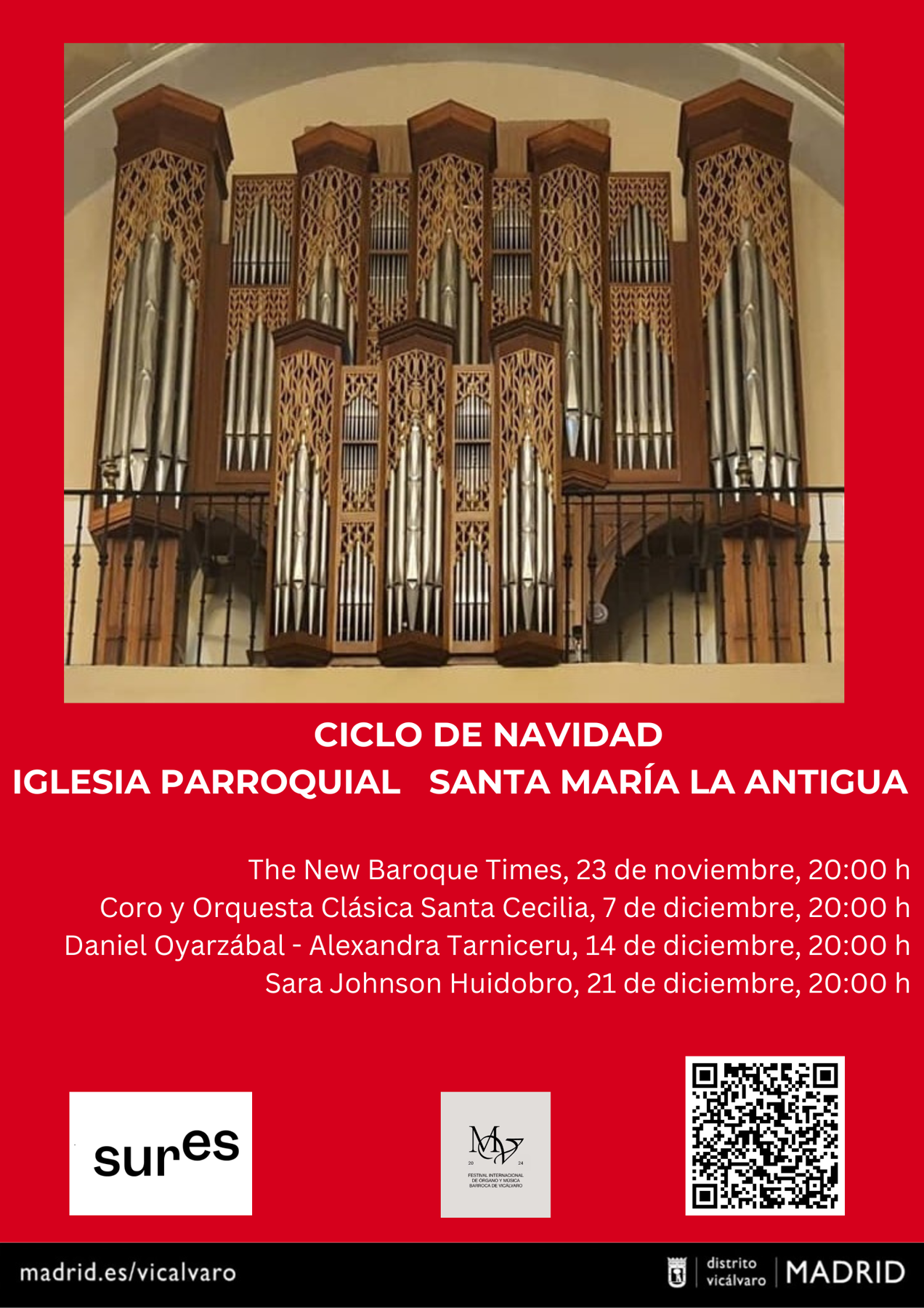 La VIII edición del Festival Internacional de Órgano y Música Barroca de Vicálvaro inicia su segunda serie de conciertos de la temporada 2024-2025 con el ciclo de Navidad. Se lleva a cabo en la Iglesia de Santa María la Antigua, donde se ofrecerán cuatro conciertos gratuitos a las 20:00 h. El programa contará con artistas internacionales como el conjunto barroco belga The New Baroque Times, el Coro y Orquesta Clásica Santa Cecilia, el solista de clave y órgano Daniel Oyarzabal, junto a la soprano Alexandra Tarniceru y la organista y clavecinista Sara Johnson Huidobro.