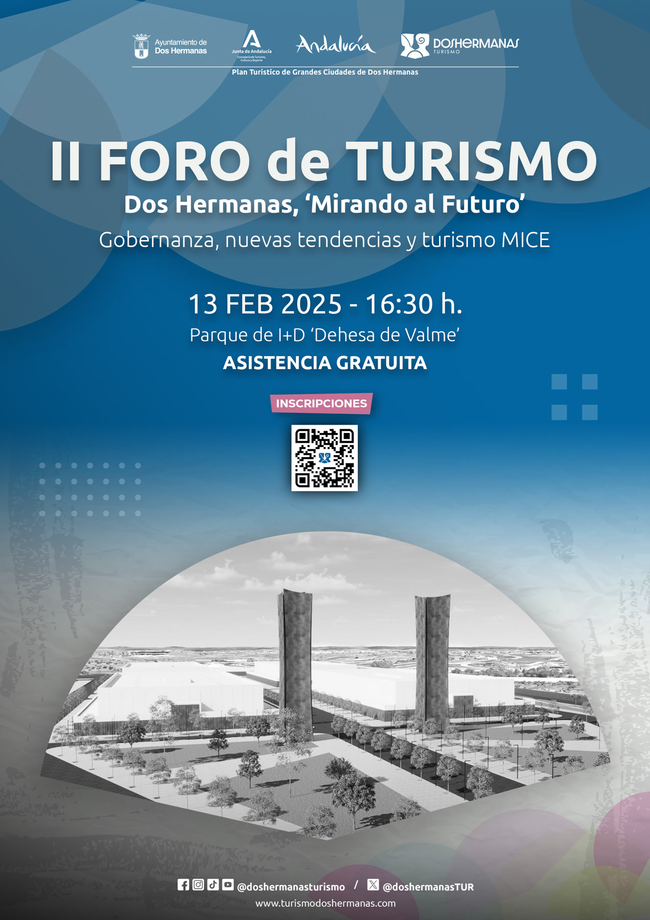 La ciudad de Dos Hermanas se convertirá en el epicentro del debate y la innovación turística con la celebración del II Foro de Turismo Dos Hermanas, Mirando al Futuro: Gobernanza, nuevas tendencias y turismo MICE. Este evento, enmarcado en el Plan Turístico de Grandes Ciudades de Dos Hermanas, tendrá lugar en el Parque de I+D Dehesa de Valme, a partir de las 16:30 horas, con asistencia gratuita previa inscripción.