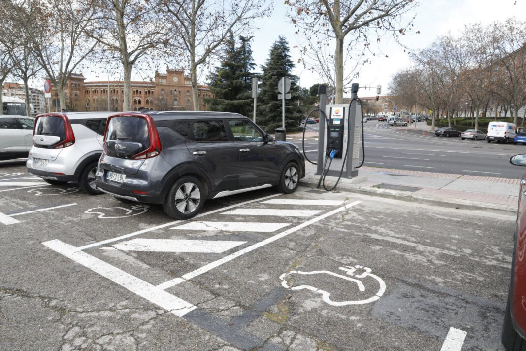 Imágenes de archivo de coches particulares realizando la recarga en diferentes estaciones de las calles de Madrid y un distintivo ECO