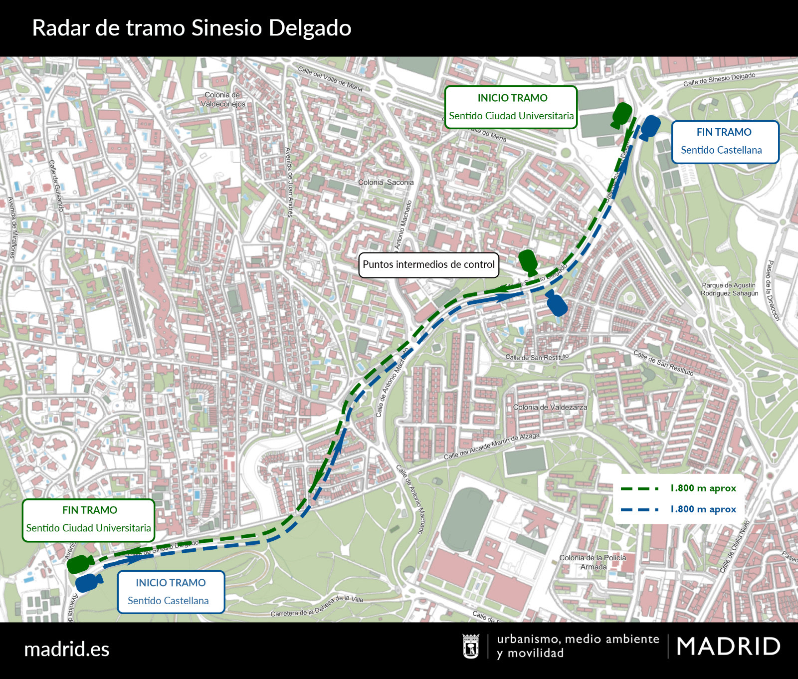 El lunes 15 de enero, a partir de las 00:00 horas, concluirá el plazo de advertencia de cuatro meses establecido por el Ayuntamiento de Madrid desde la activación de los radares de tramo multipunto (con seis dispositivos de detección) instalados en dos direcciones de la calle Sinesio Delgado. Después de esta fase, los propietarios de vehículos que superen la velocidad máxima permitida a lo largo del tramo, establecida en 50 kilómetros por hora, serán sancionados. El objetivo de la instalación de estos radares es reducir la velocidad en la zona controlada para disminuir los accidentes y garantizar la seguridad de los ciudadanos. Esta medida responde a una demanda vecinal presentada a la Junta del Distrito de Moncloa-Aravaca.