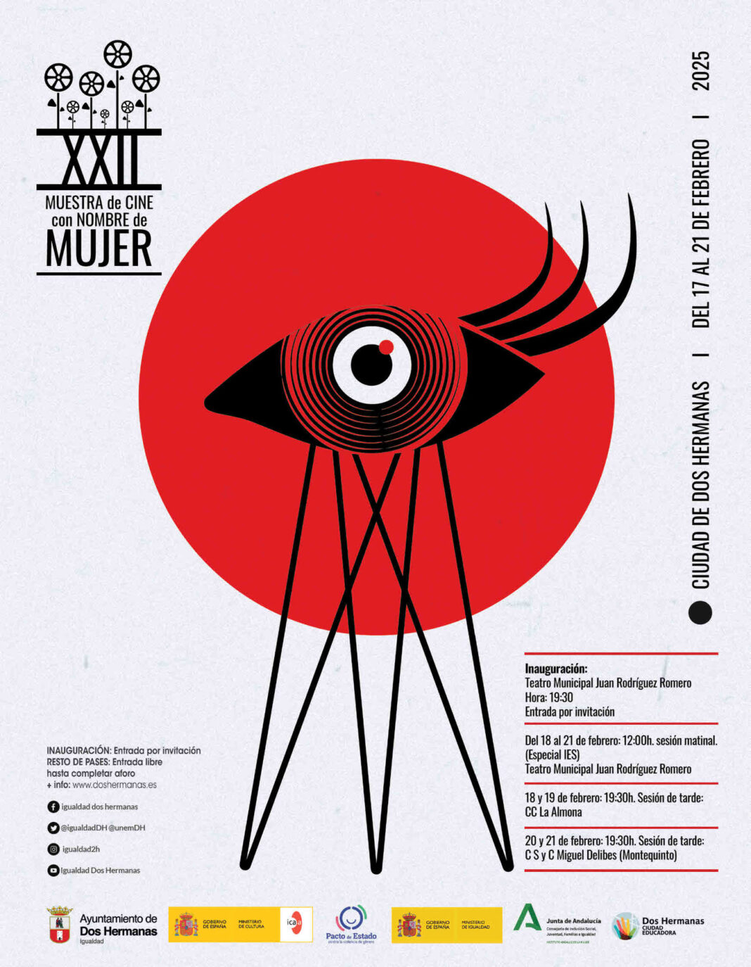 Un año más, Dos Hermanas acogerá la celebración de la Muestra de Cine “Con nombre de mujer”, que alcanza su 22 edición. Esta muestra defiende y reivindica el cine realizado por mujeres, «pues supone el reconocimiento social de los trabajos firmados por mujeres», tal como afirmó la delegada. «Sus miradas ofrecen otra forma diferente de contar historias que rompen con los estereotipos de género y nos plantean unos personajes más reales, alejados de los tópicos que siguen vigentes en buena parte del cine actual».