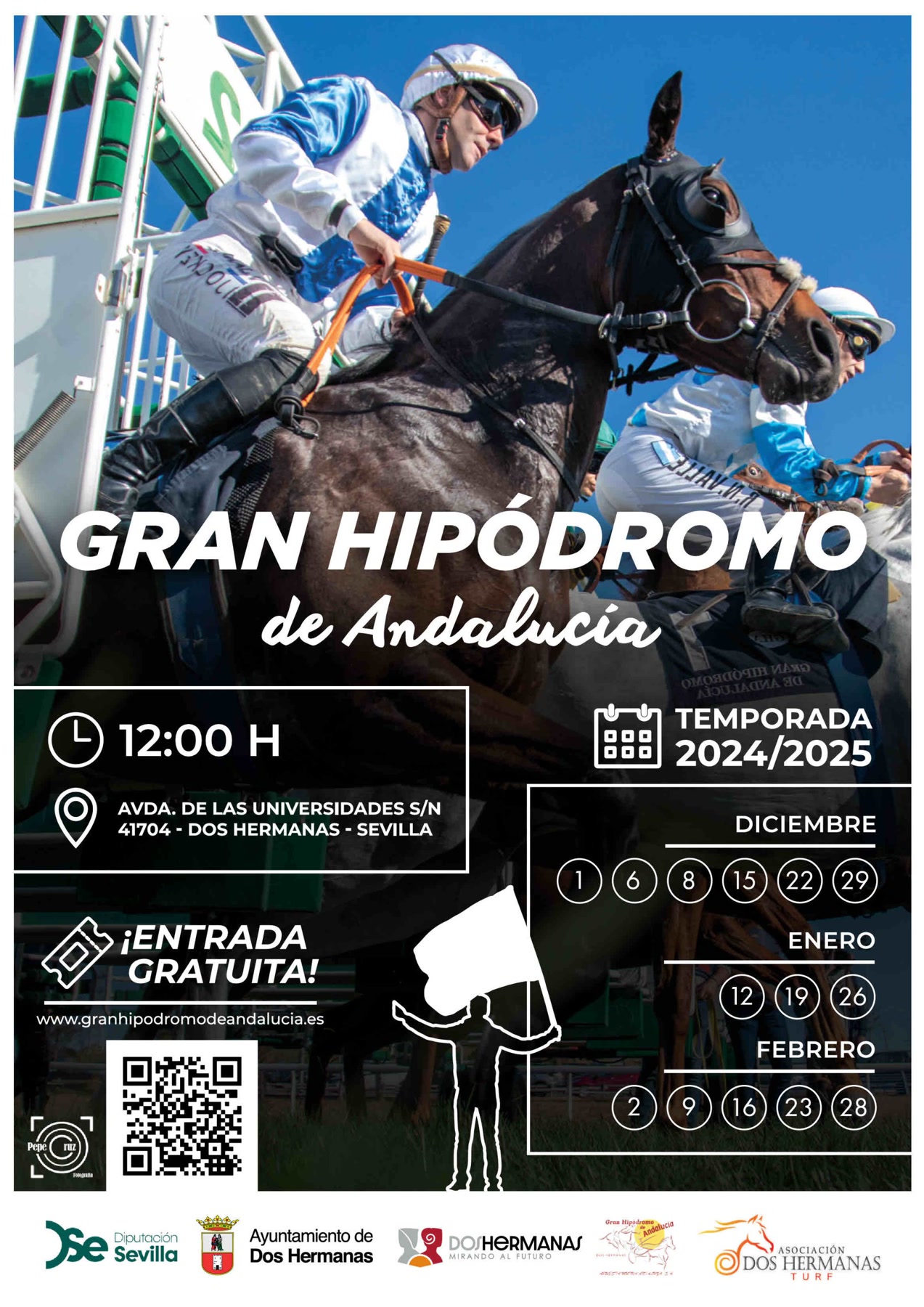 La nueva temporada de carreras 2024/25 en el Gran Hipódromo de Andalucía comenzará con un total de 14 jornadas. Estas se celebrarán en diciembre y enero, con días específicos donde los amantes de las carreras podrán disfrutar de este evento que cuenta con el **patrocinio de la Diputación de Sevilla** y el Plan Turístico de Grandes Ciudades de Dos Hermanas.