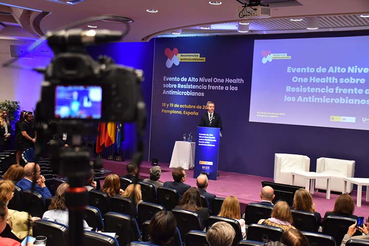 El Ministro José Miñones también reconoció el trabajo realizado por la Agencia Española de Medicamentos y Productos Sanitarios (AEMPS) y el equipo del Plan Nacional de Resistencia frente a los Antibióticos en la lucha contra las resistencias antimicrobianas. En el evento también participaron el delegado del Gobierno en la Comunidad Foral de Navarra, Valentín Velasco; el consejero de Salud, Fernando Domínguez; la directora de la AEMPS, María Jesús Lamas; y la directora de ‘One Health’ de la Comisión Europea, Roser Doménech.