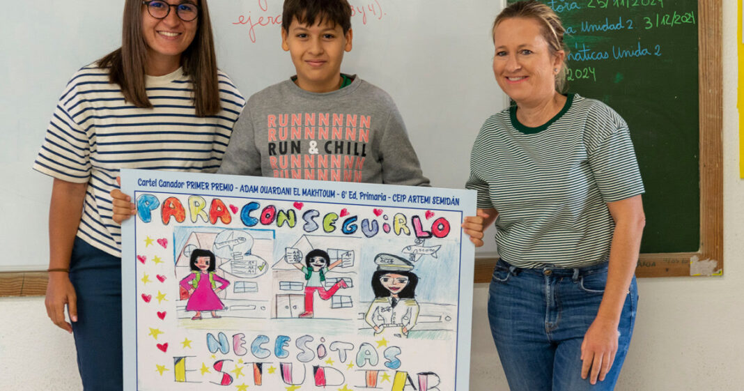 De las propuestas presentadas, resultó vencedora la del alumno Adam Ouardani El Makhtoum, del CEIP Artemi Semidán. Con el lema «Para conseguirlo necesitas estudiar», el autor plasmó en su diseño a una joven que cumple su meta de ser azafata, asistiendo a clase y esforzándose por aprobar.