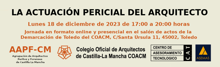 La jornada está organizada por la Agrupación de Arquitectos Peritos y Forenses de Castilla La Mancha (AAPF-CM), con la colaboración del Centro de Asesoramiento Tecnológico del Colegio Oficial de Arquitectos de Castilla-La Mancha (CAT-COACM) y el patrocinio de ASEMAS.