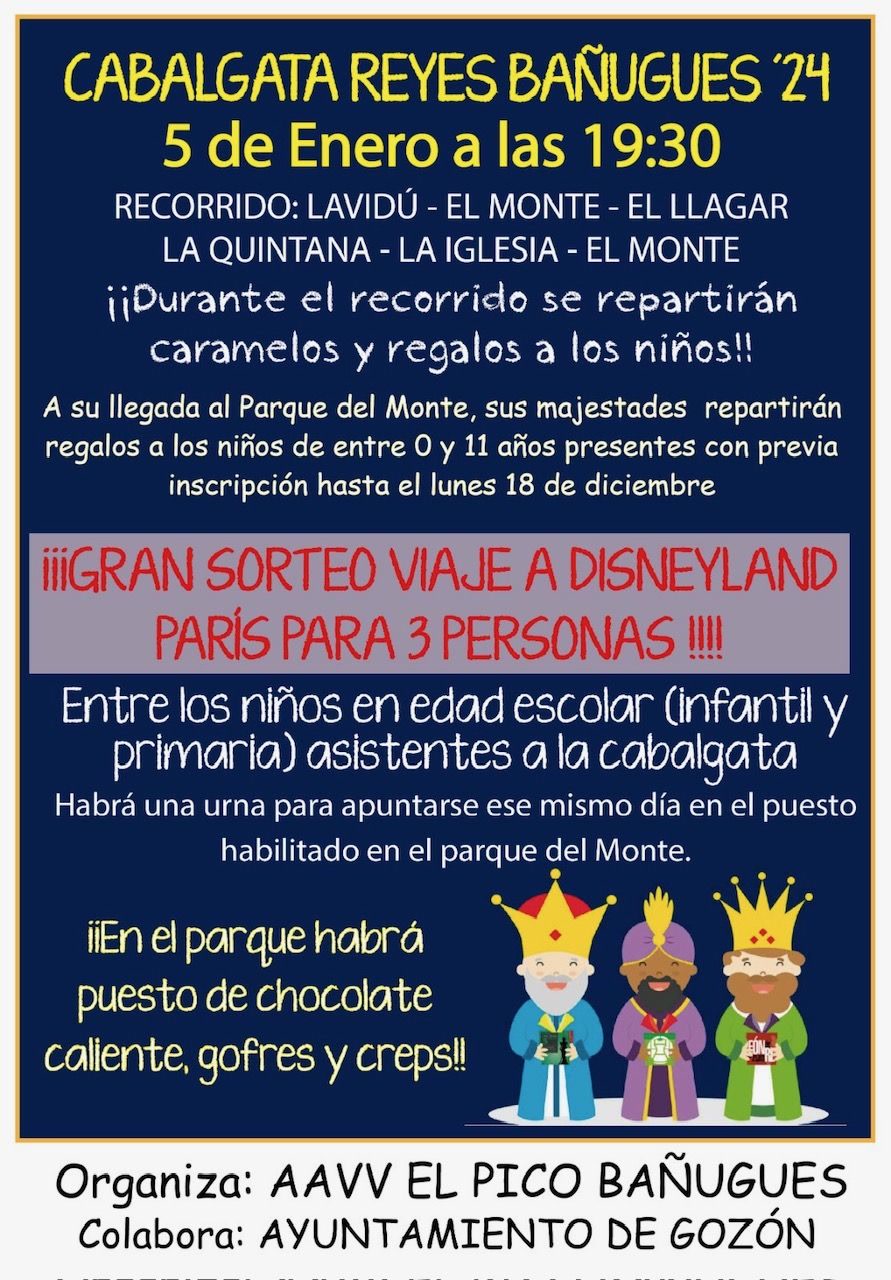 Los Reyes Magos de Oriente han decidido hacer de la Cabalgata en Bañugues, Gozón (Asturias), una tarde muy especial. Todos los niños nacidos entre 2012 y 2023 podrán inscribirse y recibir un regalo personalizado de parte de Melchor, Gaspar y Baltasar. Además, los inscritos en edad escolar de infantil y primaria podrán participar en un sorteo para un viaje a Disneyland París para tres personas. Este viaje, incluye vuelos desde Asturias, estancia en hoteles, entradas al parque y régimen de media pensión.