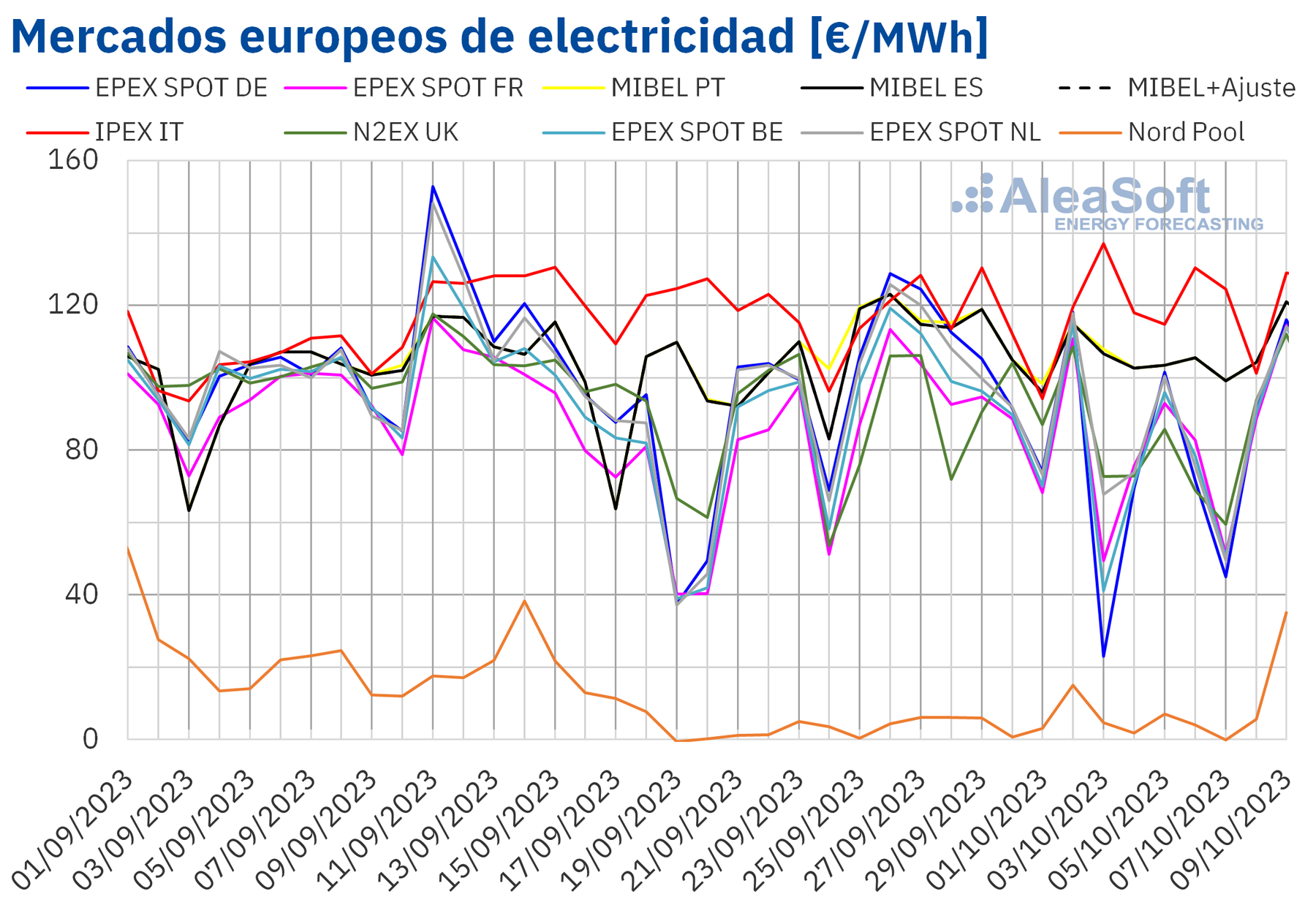 En la semana del 2 de octubre, los precios de la mayoría de los mercados eléctricos europeos analizados en AleaSoft Energy Forecasting bajaron respecto a la semana anterior. Las excepciones fueron el mercado IPEX de Italia y el mercado Nord Pool de los países nórdicos, donde el precio aumentó en un 3,9% y un 43%, respectivamente. Por otra parte, la mayor caída, del 30%, se alcanzó en el mercado EPEX SPOT de Alemania. En el resto de los mercados, los precios descendieron entre el 6,8% del mercado MIBEL de España y el 21% del mercado EPEX SPOT de Bélgica.