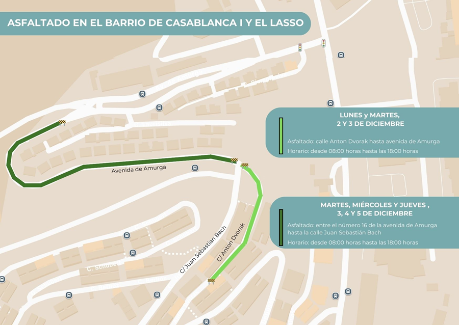 La actuación en Casablanca I y El Lasso se ha iniciado esta semana con la adecuación de las aceras para el posterior asfaltado. Este comenzará el lunes en la calle Antón Dvorak, entre el número 2 y la avenida de Amurga. Esta vía permanecerá cortada al tráfico el lunes y el martes, entre las 08:00 y las 18:00 horas.