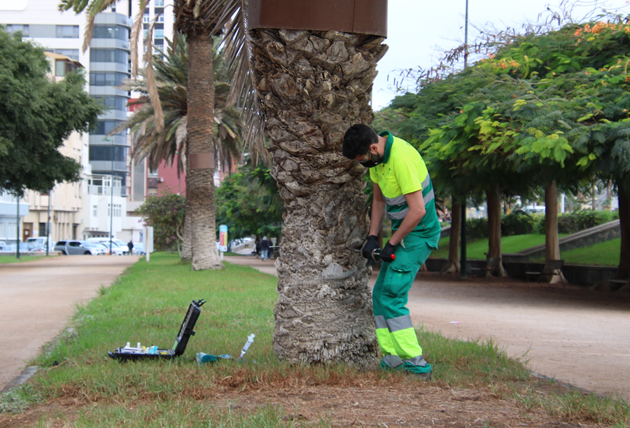 El área de Parques y Jardines del Ayuntamiento de Las Palmas de Gran Canaria ha desplegado un operativo para poner en tratamiento 1.800 palmeras canarias con el fin de combatir la Diocalandra Fumeris, un escarabajo de pequeñas dimensiones extendido en las islas. La técnica utilizada es la endoterapia que, a través de una pequeña incisión en la estípite, permite introducir la materia activa efectiva contra estos insectos, que suelen morar en la zona más carnosa de las palmas.