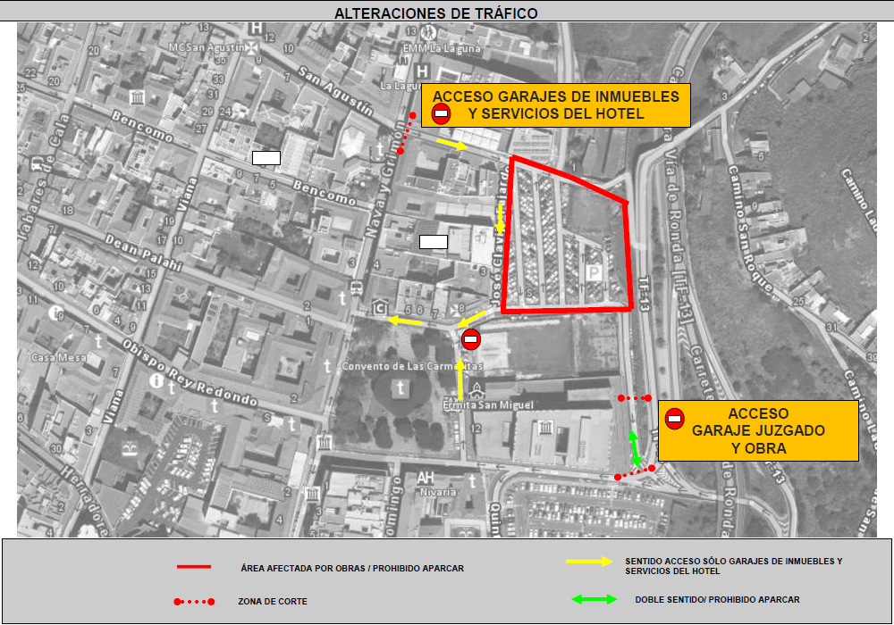 El acceso a la calle José Clavijo y Fajardo será habilitado a través del Camino San Roque, comenzando desde las 7:00 horas del lunes. Solo se permitirá el acceso a los propietarios de garajes de los inmuebles de la zona y a los diferentes servicios que requiere La Laguna Gran Hotel. El concejal de Obras, Ángel Chinea, ha detallado que “se habilitará una línea de carga y descarga en la calle que conectará el Camino San Roque con la plaza del Adelantado” con el fin de minimizar la afectación al hotel.